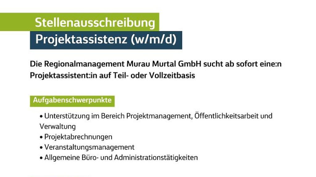 Die Regionalmanagement Murau Murtal GmbH sucht ab sofort: Projektassistent:in auf Teil- oder Vollzeitbasis