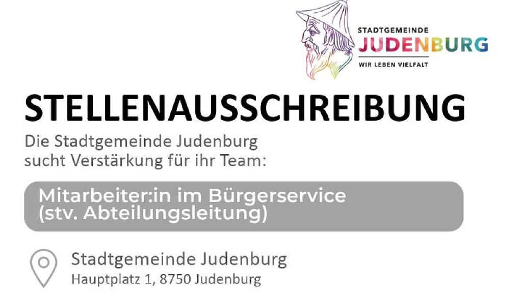 Die Stadtgemeinde Judenburg schreibt folgenden Dienstposten öffentlich aus: Mitarbeiter:in im Bürgerservice (stellvertretende Abteilungsleitung)