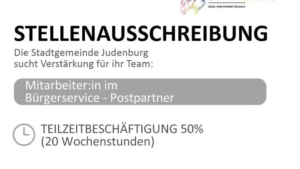 Bewerbungen sind bis spätestens 06.09.2024 unter Beifügung der üblichen, aussagekräftigen Unterlagen an die Stadtgemeinde Judenburg, Referat Personal, 8750 Judenburg, Hauptplatz 1, oder an die E-Mail-Adresse: g.hinteregger@judenburg.at zu richten.
